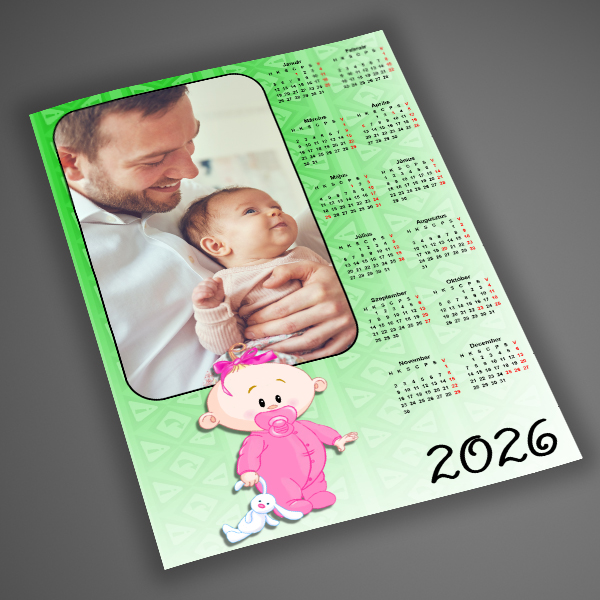 Az A4-es méretű, egyoldalas 2026-os naptár vidám zöld háttérrel és cuki babafigurával készült, így tökéletes választás újdonsült szülőknek, nagyszülőknek vagy keresztelős ajándéknak.