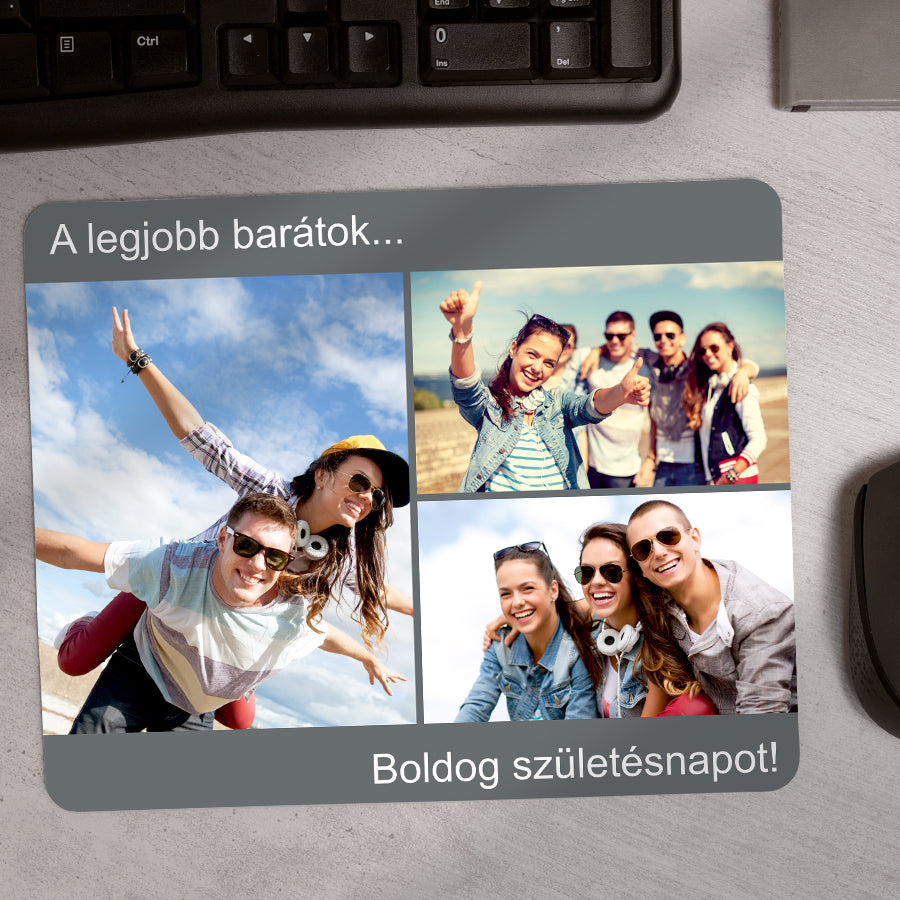 🖱️ Fényképes egérpad 3 képpel és egyedi felirattal – a legjobb barátoknak! Tökéletes ajándék születésnapra...