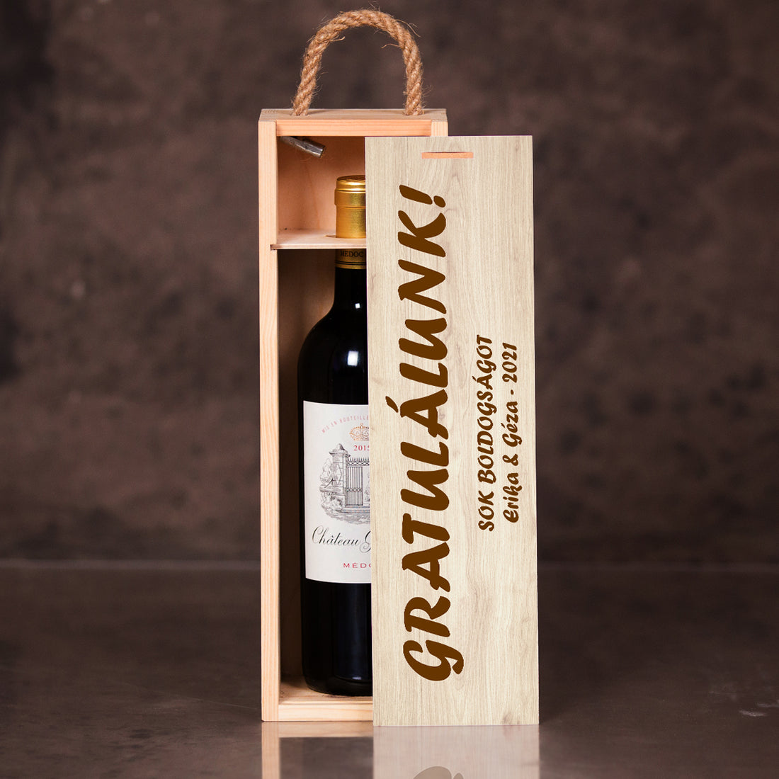 Egyedi fa borosüveg doboz „Gratulálunk” felirattalKülönleges alkalomra keres ajándékot, ami elegáns és személyes egyszerre? Ez...
