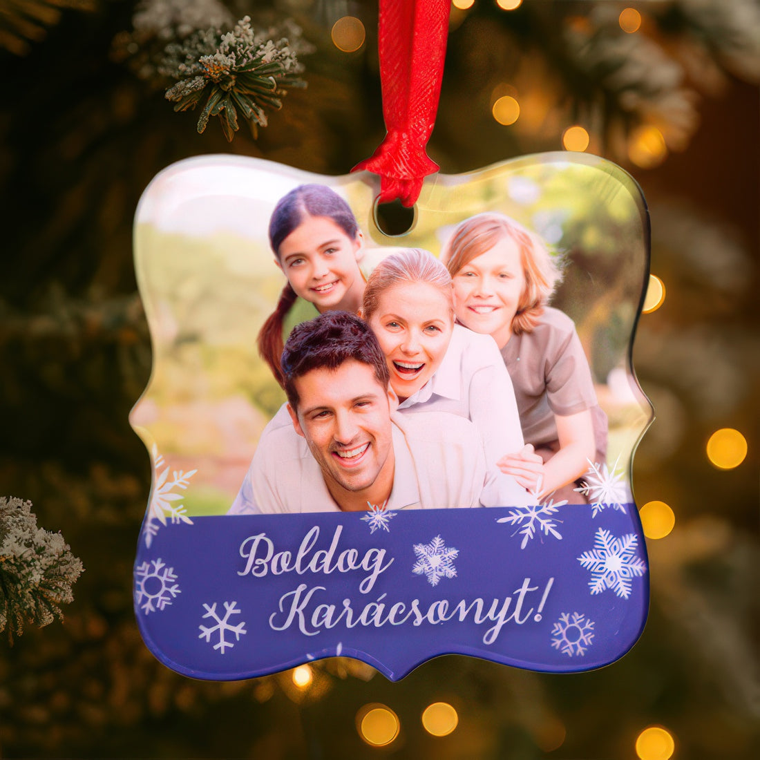 🎄 Egyedi fényképes akril karácsonyfadísz – kék, hópelyhes mintával Tegye különlegessé az ünnepet ezzel a...