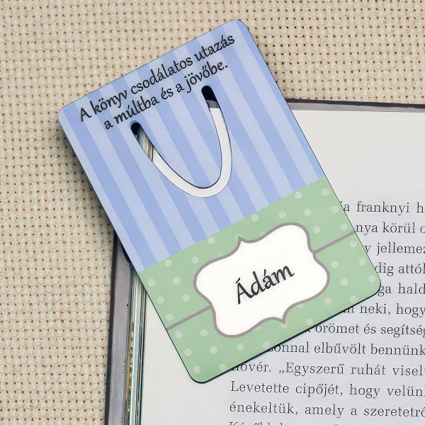 📘 Egyedi fém könyvjelző névvel – kék csíkos-pöttyös design Tökéletes választás minden könyvszeretőnek! Ez a...