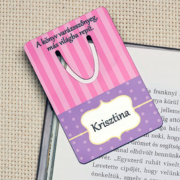 📖 Egyedi fém könyvjelző névvel – rózsaszín csíkos-pöttyös design Tökéletes ajándék minden könyvszeretőnek! Ez a...