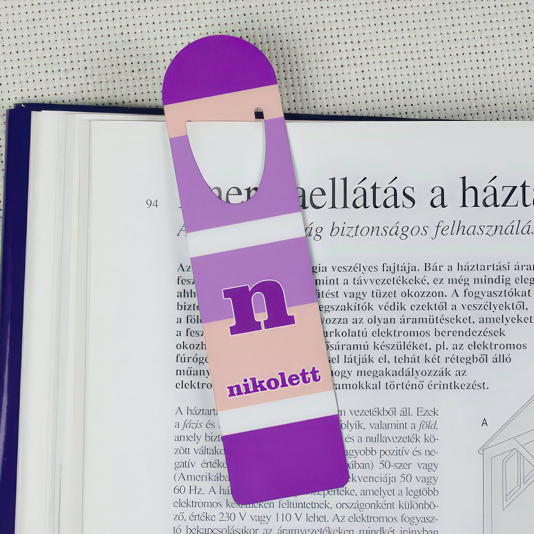 💜 Egyedi lila csíkos fém könyvjelző – névvel és kezdőbetűvel Tedd különlegessé az olvasás élményét...