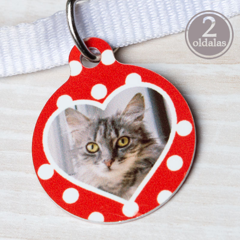 🐾 Kétoldalas fém macskabiléta – piros-fehér szíves design Tegye kedvencét biztonságossá és stílusossá ezzel az...