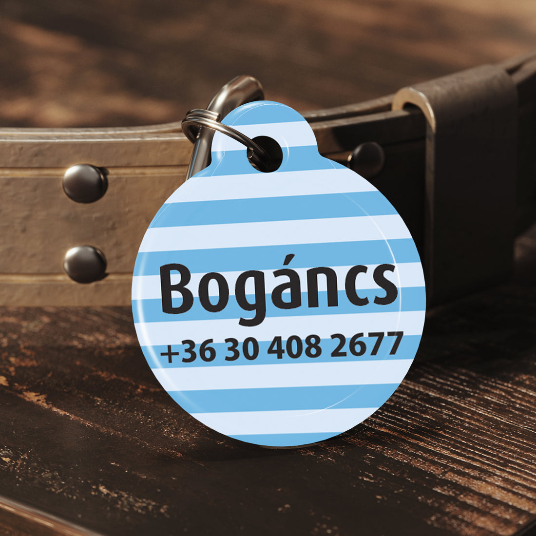 🐾 Kör alakú fém kutyabiléta – kék csíkos design Biztonság, stílus és szeretet egy apró...