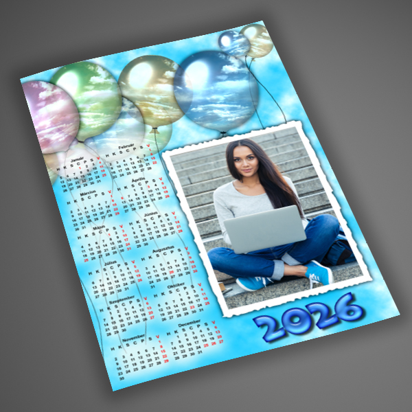 A naptár bal oldalán a teljes 2026-os év látható áttekinthető formában, míg a jobb oldalon a személyes fényképed kap főszerepet.