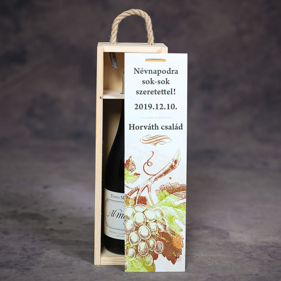Ajándékozz bort elegánsan ezzel a szőlőmintás, egyedi felirattal ellátott borosüvegdobozzal! Kiváló választás névnapra, születésnapra vagy borkedvelőknek. A dobozra saját szöveg kerülhet, így teljesen személyre szabható.
