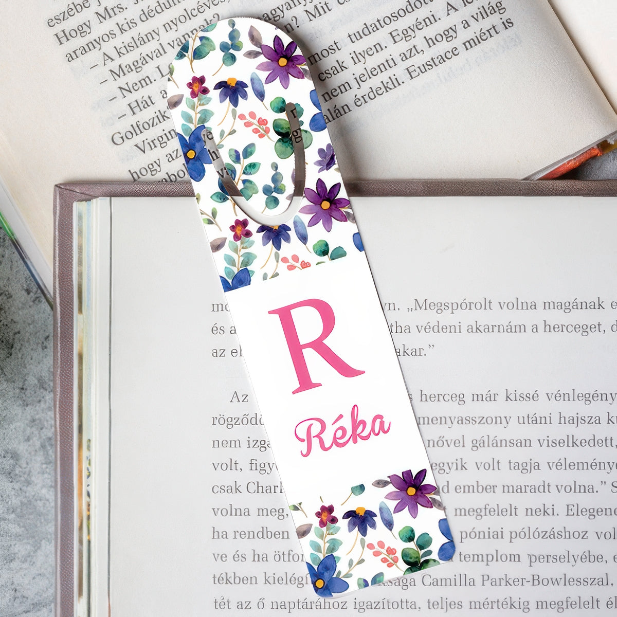 🌸 Egyedi fém könyvjelző névvel és kezdőbetűvel – virágmintás kivitel