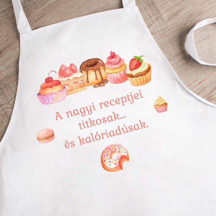 Ez az édes mintás kötény nemcsak a konyhában hódít, hanem mindenki szívét is elrabolja! A színes, cukrászati hangulatot idéző süteménygrafika a kötény fix része, a középen elhelyezett háromsoros felirat viszont teljesen szabadon megadható – így bármilyen névvel, idézettel vagy humoros üzenettel személyessé tehető.