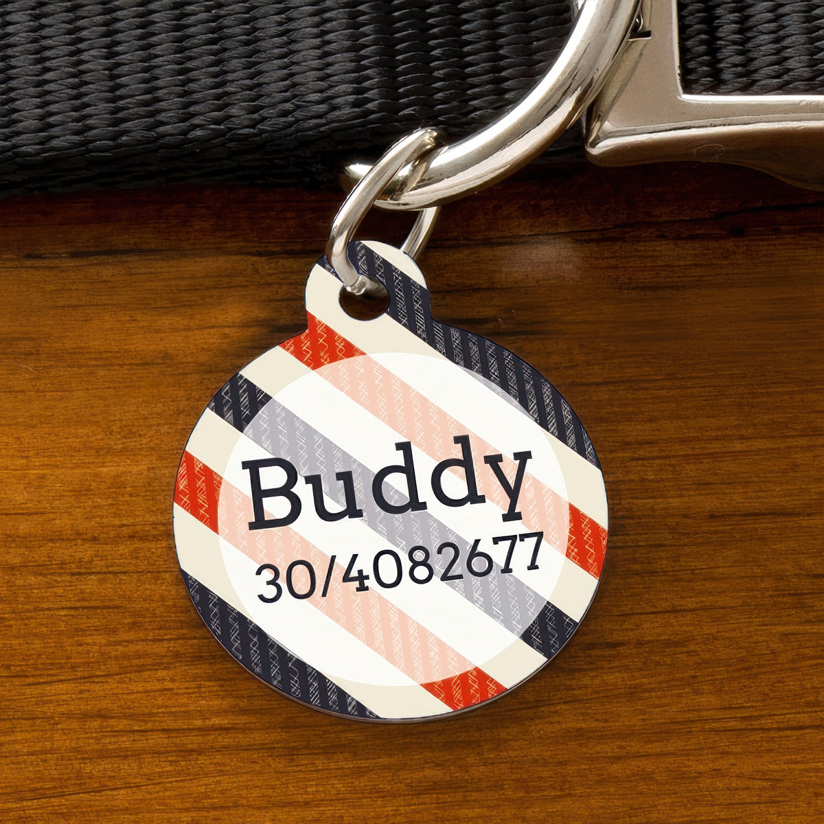A kör alakú, piros-kék-fehér csíkos mintás fém kutyabiléta nemcsak esztétikus, hanem segít abban is, hogy ha kedvence elkóborolna, gyorsan visszataláljon Önhöz. A bilétán jól olvashatóan szerepelhet a kutya neve és a telefonszám.