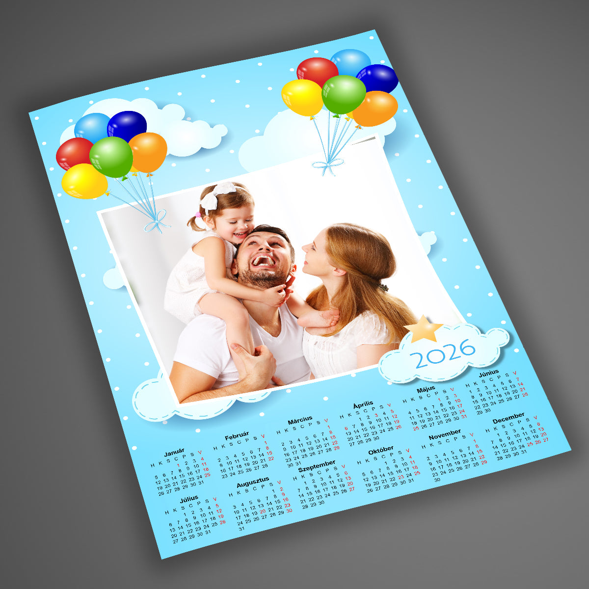 Az A4-es méretű, egyoldalas 2026-os naptár világoskék, pöttyös háttérrel és színes lufikkal díszített keretet kapott, amely garantáltan feldobja bármelyik szobát.