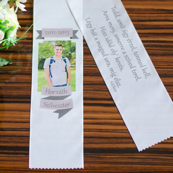 Szeretne valami igazán egyedi szalagot a csokorra? Egy fényképes ballagási szalag kitűnő választás és örök emlék lehet minden diák számára. A szalag egyik oldalát a diák fényképe díszítheti, a másik oldalára pedig az Ön által választott idézet kerülhet. A fényképes ballagási szalag cikk-cakkban végződik, szélessége 7cm, hossza 150cm.