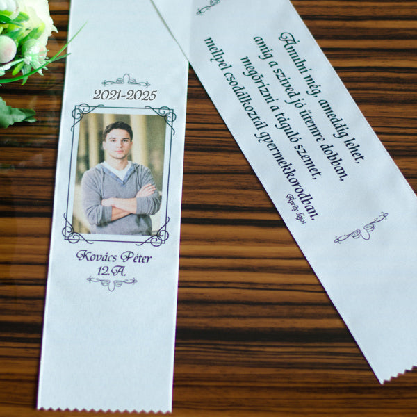 Szeretne valami igazán egyedi szalagot a csokorra? Egy fényképes ballagási szalag kitűnő választás és örök emlék lehet minden diák számára. A szalag egyik oldalát a diák fényképe díszítheti, a másik oldalára pedig az Ön által választott idézet kerülhet. A fényképes ballagási szalag cikk-cakkban végződik, szélessége 7cm, hossza 150cm.