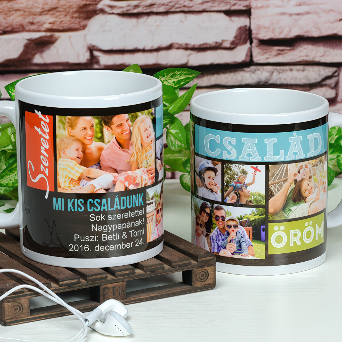Ez az egyedi családi fényképes bögre több kisebb és nagyobb képet is tartalmazhat, melyeket egy rövid üzenettel tehetsz még személyesebbé.