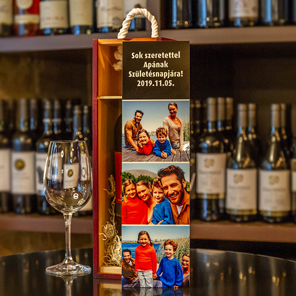 A természetes fa borosdoboz letisztult, elegáns megjelenésével kiemeli az ajándékba szánt bor különlegességét, a fényképek és az egyedi üzenet pedig személyes emlékké teszik.