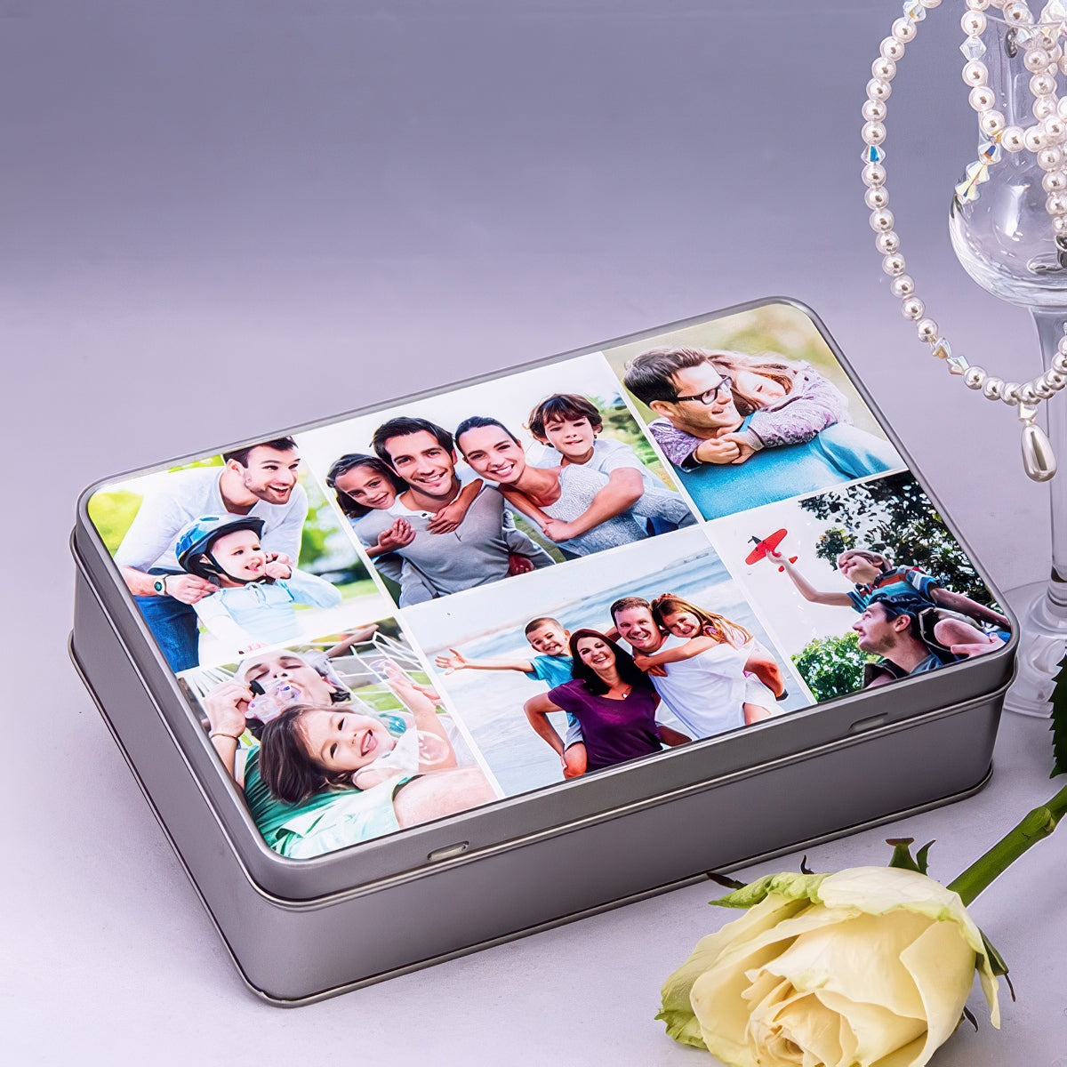 📸 Egyedi fényképes fémdoboz hat fotóval – Személyes családi ajándék