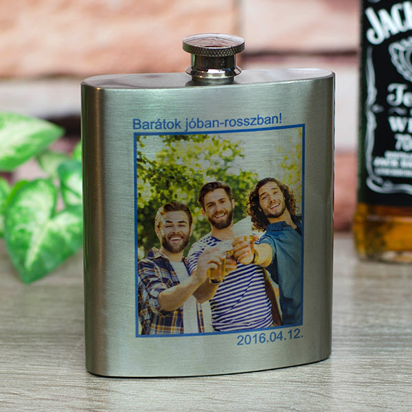 Ha egy ötletes és kreatív ajándékkal szeretné meglepni szeretteit, akkor ne keresgéljen tovább... ezzel az egyedi fényképes flaskával garantáltan mosolyt csalhat mindenki arcára. Legyen szó születésnapi-, névnapi- vagy karácsonyi ajándékról, ezzel az egyedi fényképes flaskával még szebbé teheti az ünnepet. A flaska rozsdamentes acélból készült, melynek űrtartalma 200ml. FIGYELEM! A fénykép alapszíne a flaska fémes alapszíne, így a fehér és világos árnyalatok ezt fogják visszaadni.