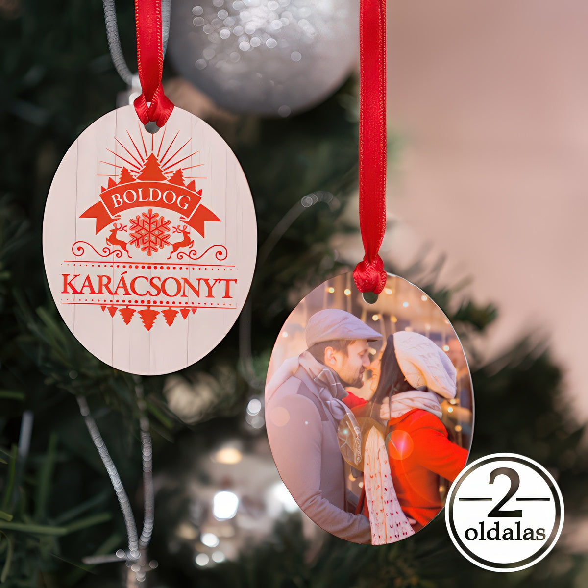 Kétoldalas ovális fényképes karácsonyfadísz – egyedi ajándék az ünnepekre