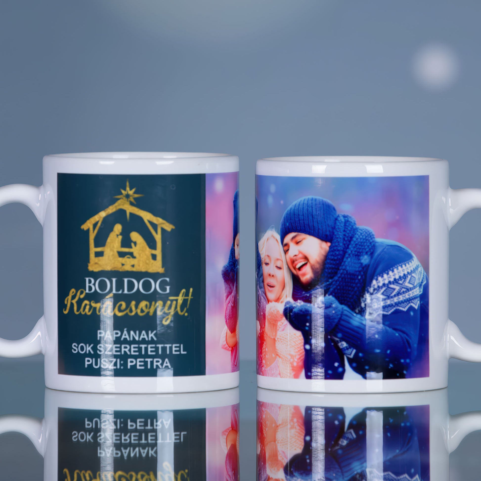 A klasszikus Betlehem-motívum és a „Boldog Karácsonyt!” felirat ünnepi hangulatot teremt, a kedvenc fényképpel és rövid személyes üzenettel kiegészítve pedig igazán meghitt és egyedi ajándék lesz belőle.