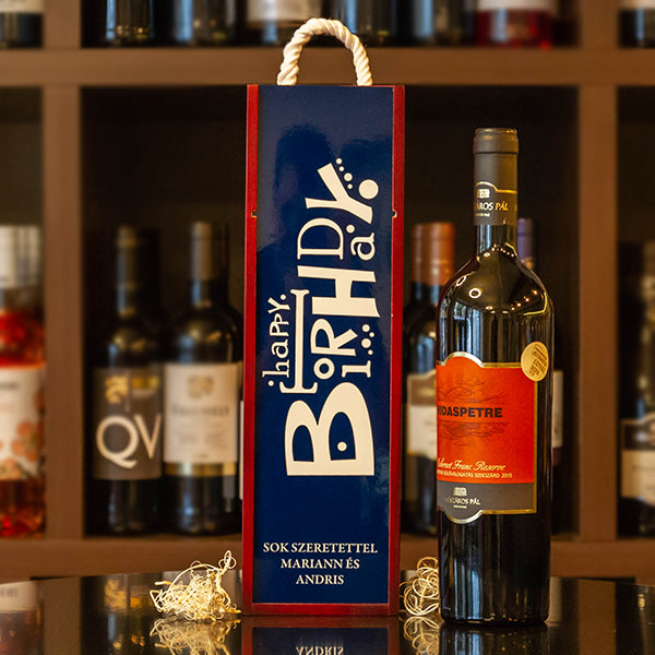 Különleges borhoz különleges csomagolás! Lepd meg szeretteidet ezzel az egyedi, „HAPPY BIRTHDAY” feliratú borosüvegdobozzal, amelyet egy személyes, akár 4 soros üzenettel is kiegészíthetsz. Elegáns, mégis vidám ajándék születésnapra, borkedvelőknek.