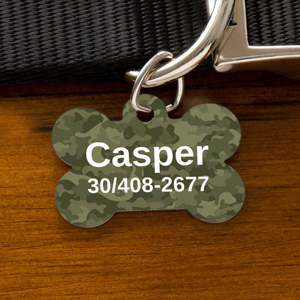 🐾 Csont alakú fém kutyabiléta – terepmintás kivitel